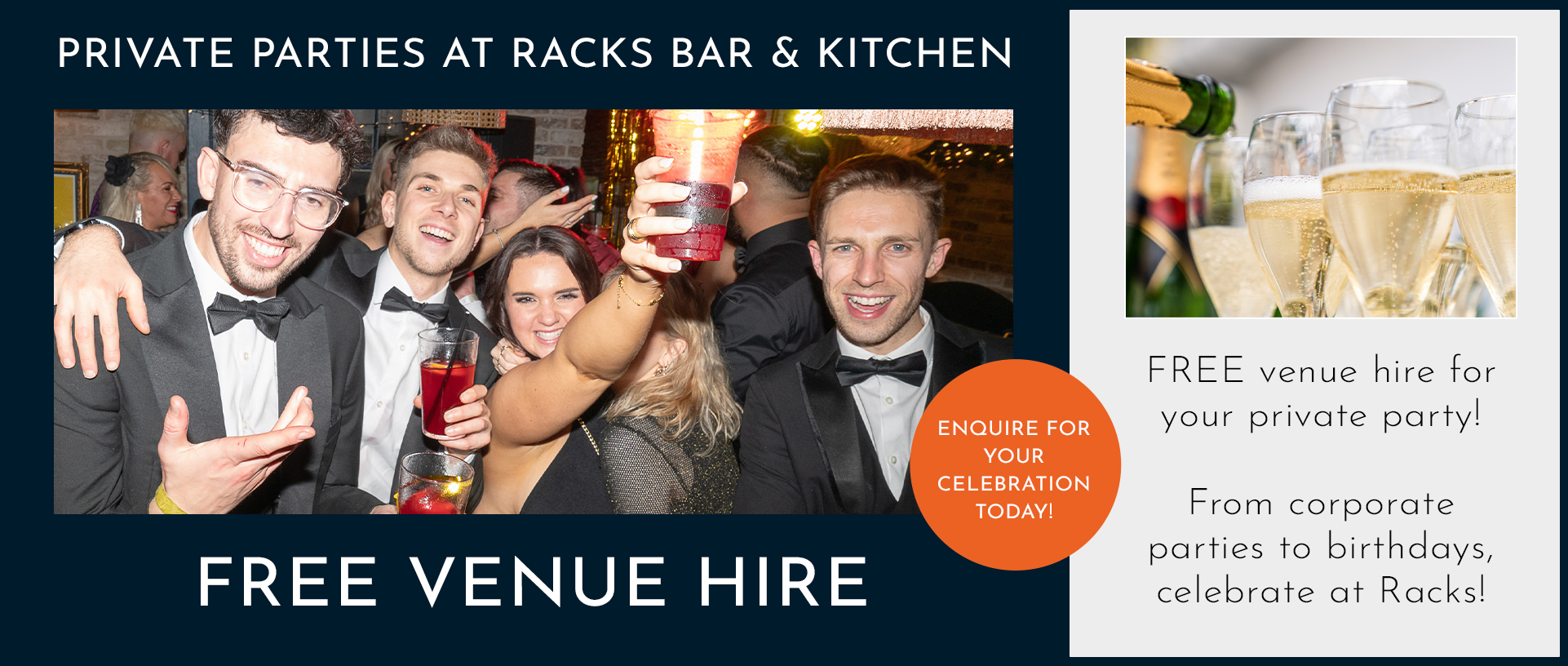 Free party venue hire for up to 170 guests at Racks. If you know what type of event you’d like to host, choose from the event options below and