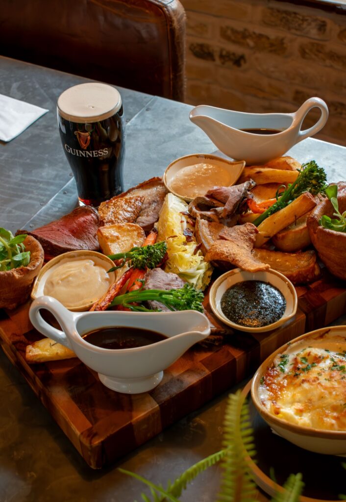 Racks Bar & Kitchen's Sunday roast sharing board in Clifton, Bristol – featuring dry-aged beef rump, roast leg of lamb, Herefordshire pork belly with crisp crackling, goose fat roast potatoes, celeriac purée, Yorkshire puddings, sticky red cabbage, seasonal vegetables, mint sauce, apple sauce, and bottomless gravy. Ideal for Sunday lunch in Bristol.