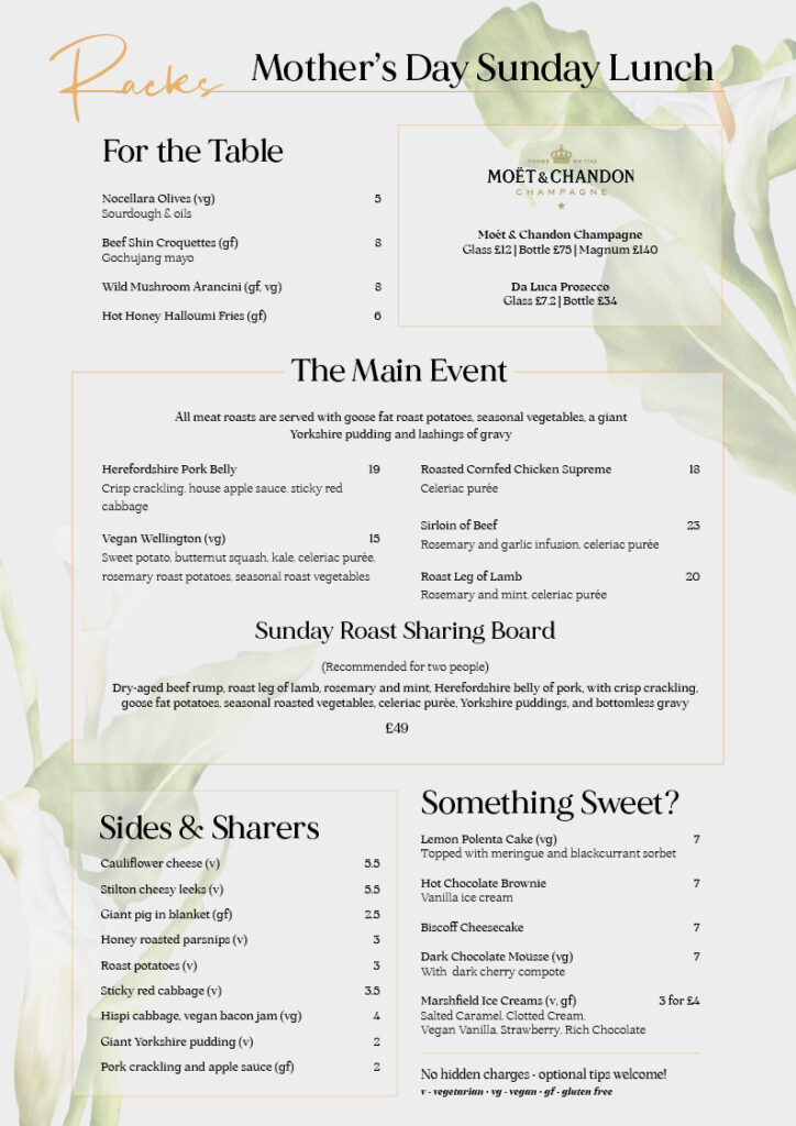 Book for an Mother’s Day Sunday lunch on March 15th using this form.